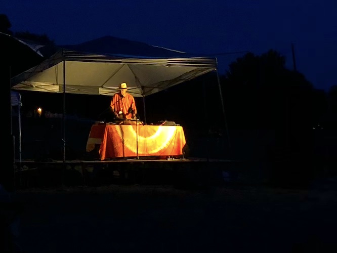 A truly sunning moment occurred when two killdeer suddenly shot upwards from behind the stage above Allred like a fountain. They ascended in graceful arcs and loops high over the audience’s heads perfectly in time with the music. It was such a perfect moment of harmonious synchronicity, it would be easy to believe the birds were drawn by Allred’s paradisiacal songs. It was like as though they were dancing to Allred’s melodies, as they curlicued up into the atmosphere.