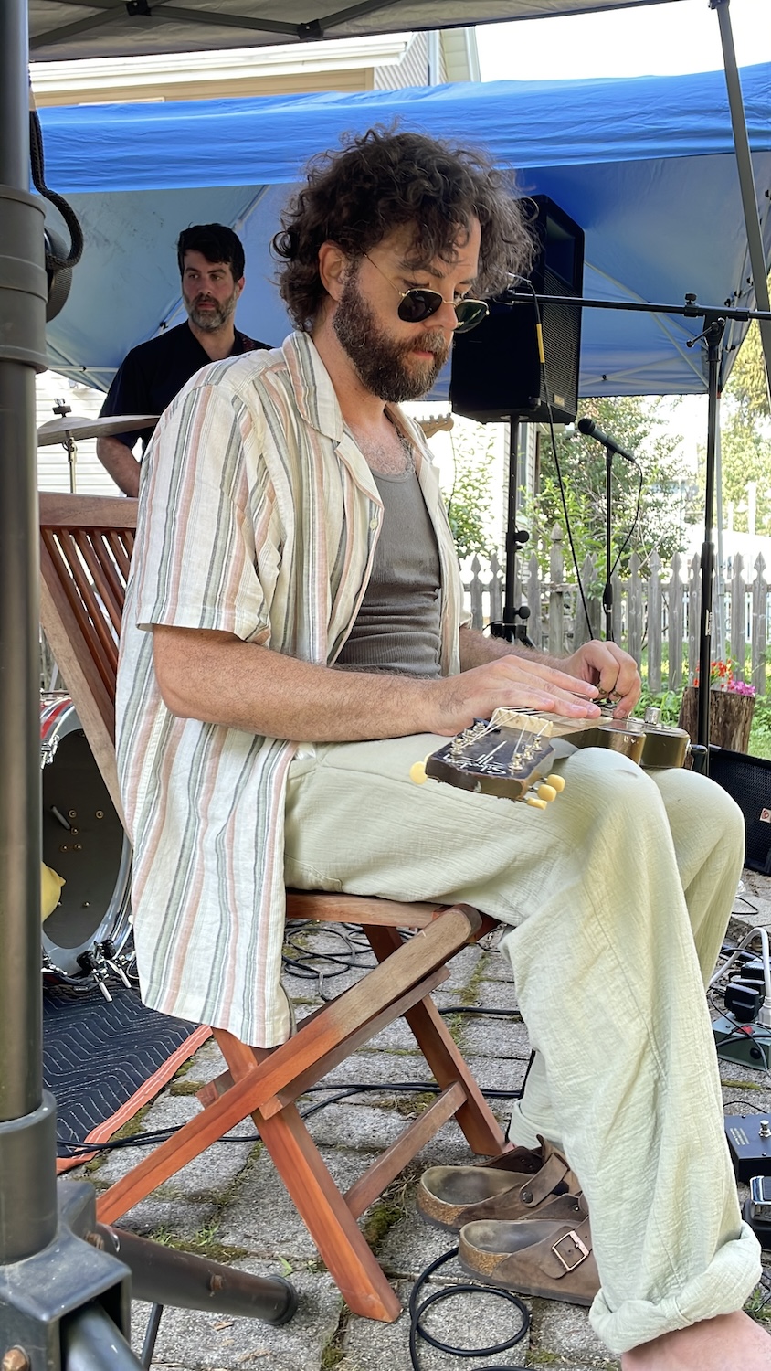 For the opening set, Ornamental brought the cedar grove ambiance of their South Jersey home through their bucolic folk songs. With lap steel, hand-tapped drums and acoustic guitars, Lucia Gardiner and her friends Evan Whitenack and Niko Berardo (of Te Vista, another great Jersey group) were utterly transfixing under the dappled sunlight with their gossamer, homespun sound and soothing rhythms. There was a great warmth and closeness that radiated out from this intimate performance, which set the tone for the day perfectly. It felt exactly like what it was: some good friends jamming together and having fun on a patio on a summer afternoon. Their music needs to be experienced in a setting like this. Gardiner’s breezy vocals, bluesy guitar lines and Whitenack’s deep twangy slide work blended nicely into the sound of the rustling leaves, singing robins and other backyard sounds.